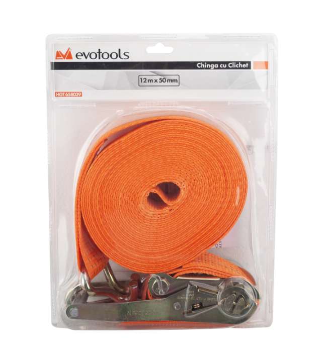 Este tipo de cincha, marca EvoTools®, es ideal para asegurar el transporte de mercancías gracias al alto nivel de seguridad que ofrece. Gracias a sus dimensiones reducidas, puede utilizarse y almacenarse con facilidad. La cincha está fabricada en poliéster, con un mecanismo de anclaje de carraca de acero zincado y un gancho doble en forma de “J”, también de acero zincado. La cincha tiene una longitud de 12 m y un ancho de 5 cm.
