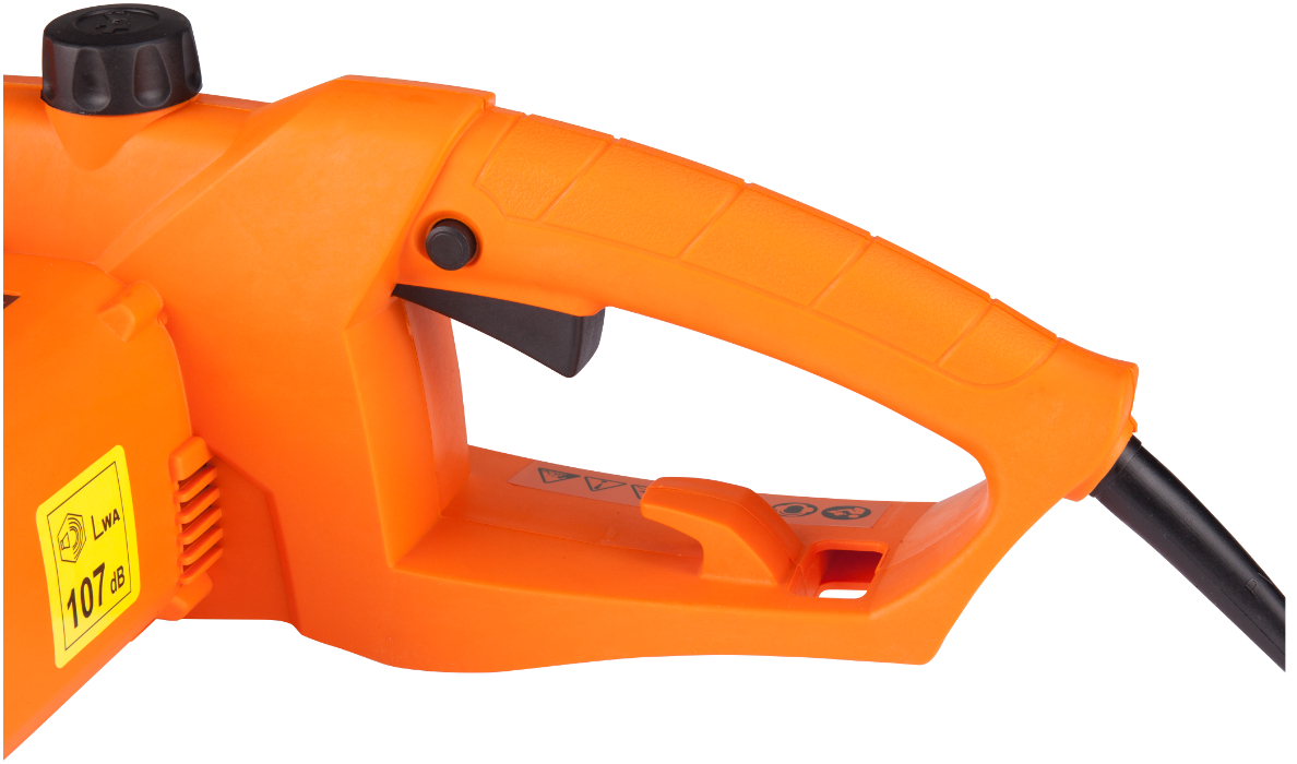 La sierra cuenta con un sistema de tensado rápido de la cadena, freno de cadena de reacción rápida / protector de mano (en caso de retroceso la cadena se detiene en unos milisegundos) y dispone de un depósito de aceite para la lubricación continua de la cadena.